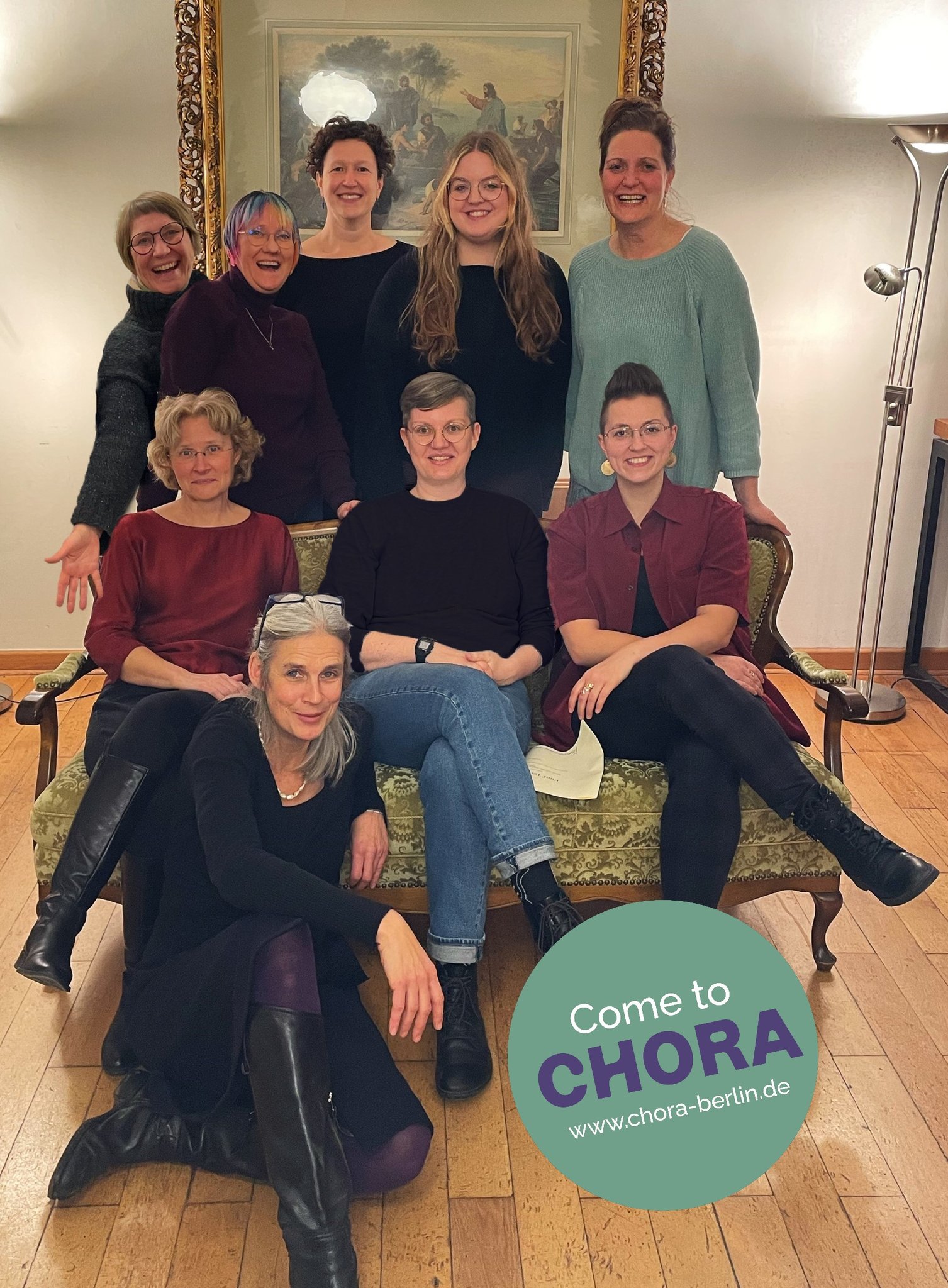 CHORA besteht aus erfahrenen, engagierten Sängerinnen, die einen fortgeschrittenen bis semi-professionellen Anspruch haben. Die Proben finden wöchentlich Mittwochabend von 19 bis 21:15 Uhr in Berlin-Moabit, 2 Gehminuten vom U-Bhf. Turmstraße, statt. Das Ziel ist der Aufbau eines Konzertchores mit bis zu 40 Sängerinnen.